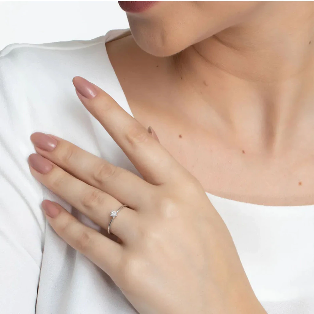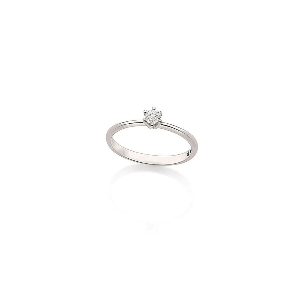 Com um design leve e elegante, este anel solitário em ouro branco com diamante traduz a suavidade e a pureza da alma.