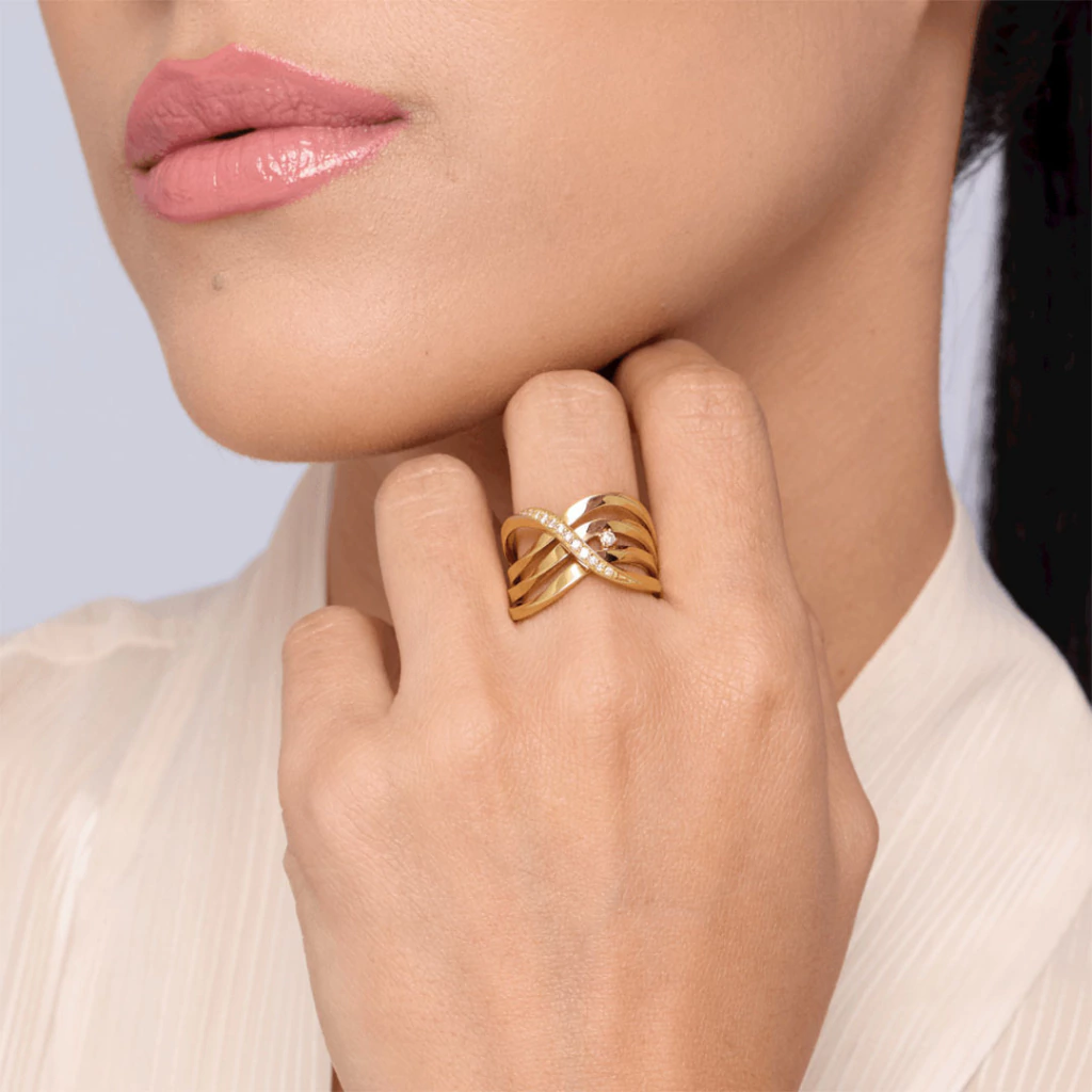 Um anel desejado por toda mulher, vistoso e sofisticado, com um design cujas curvas e diamantes capturam a luz, brilhando a cada movimento das mãos. Uma joia elegante e atemporal para todas as ocasiões.
