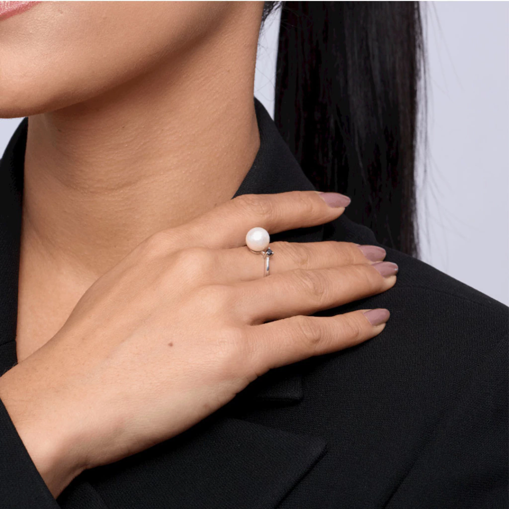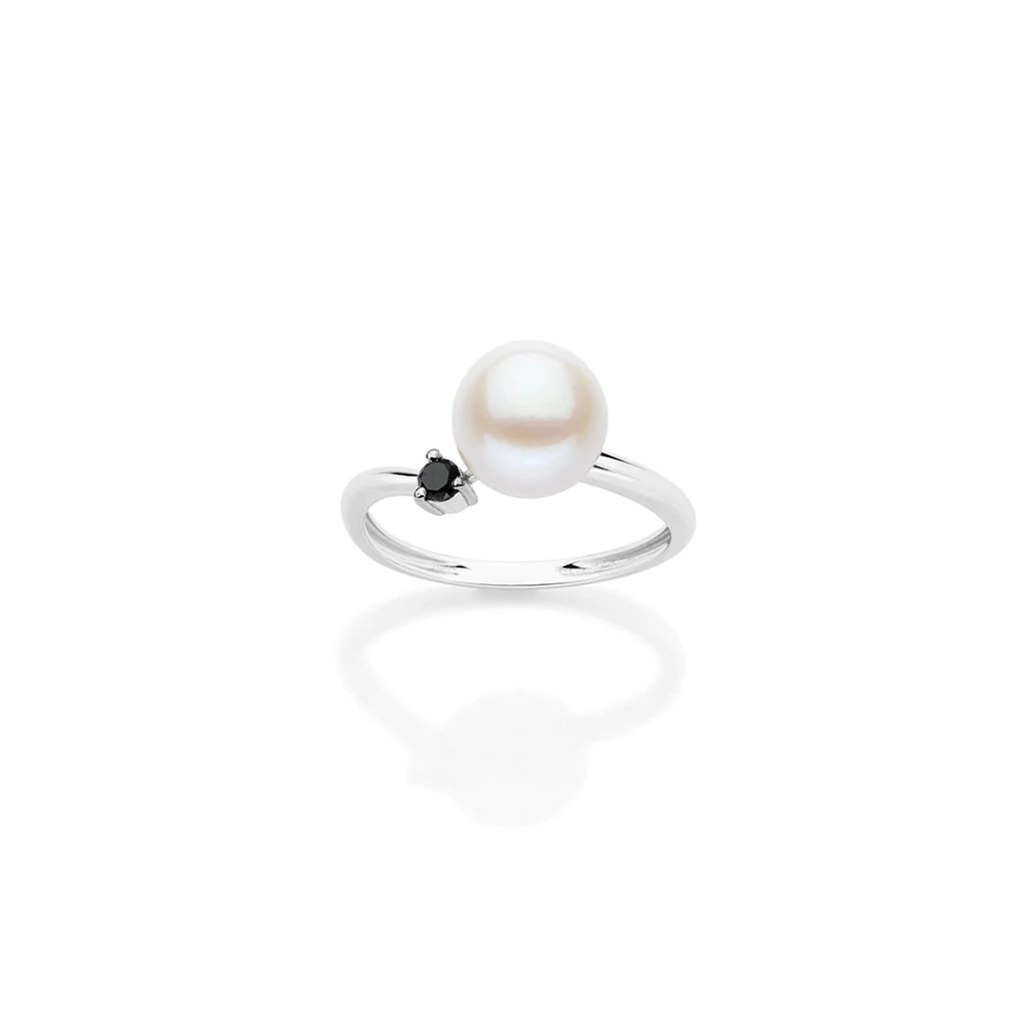 Anel em ouro branco 18k, com diamante black e pérola biwa
