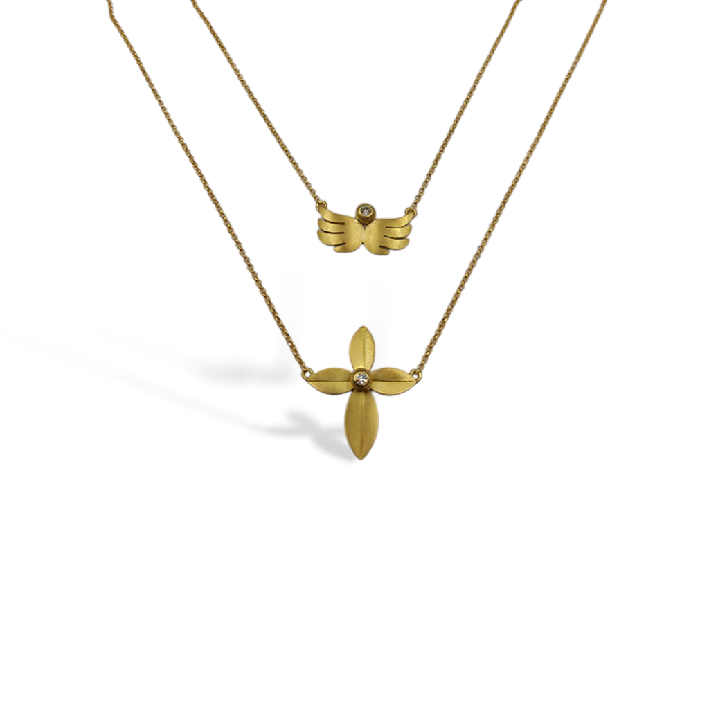 Gargantilha em ouro amarelo 18k com 1 diamante - Asas 16mm x 8,9mm - Cruz 16,3mm x 19,5mm - Elos portugueses 1mm / 60cm