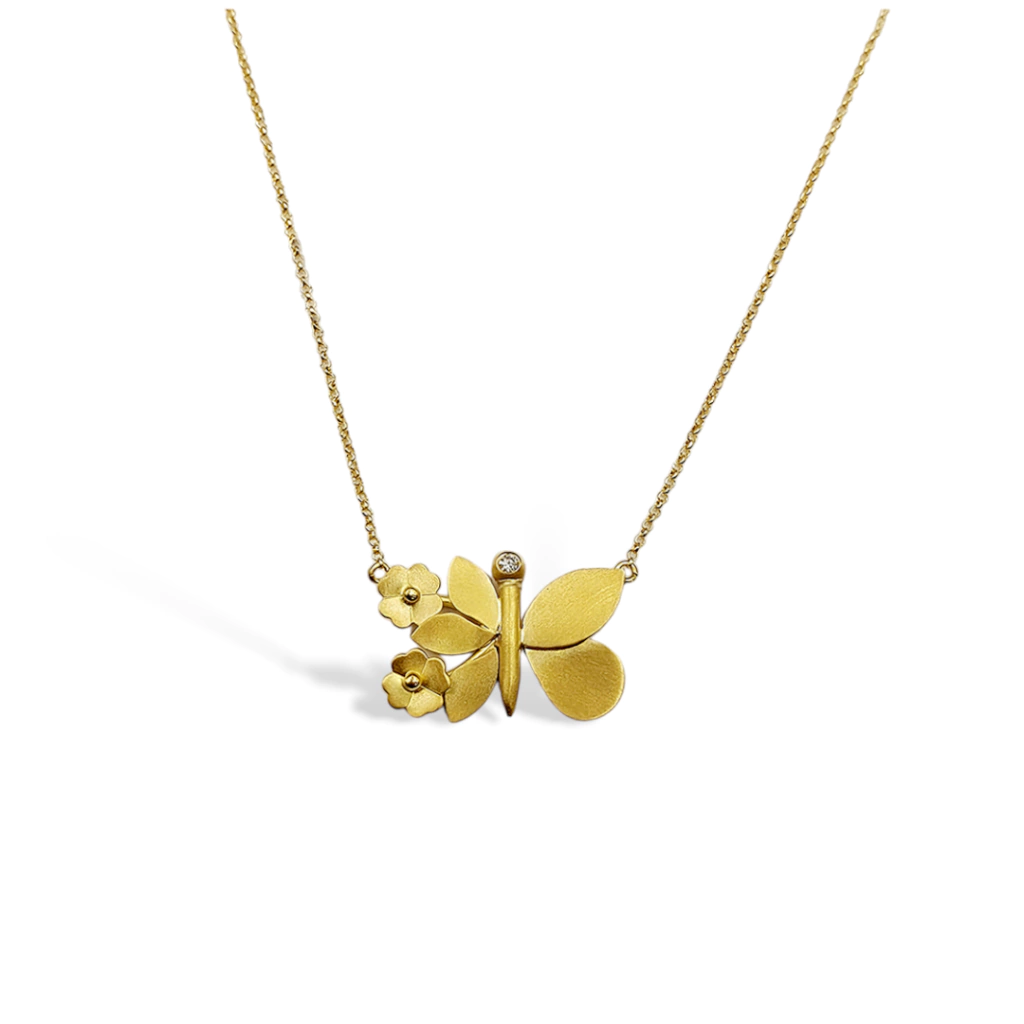Gargantilha em ouro amarelo 18k com 1 diamantes - Borboleta 2 flores fosco 21mm x 15mm - Elos portugueses 1mm / 45cm